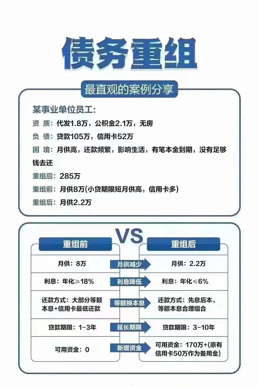 債務重組方案走完後,重組前貸款年化大於18%,重組後年化小於6%,並且重組後可以先息後本還款,貸款期限3到10年,額度高有新增可用資金。債務重組果真這麼香嗎?