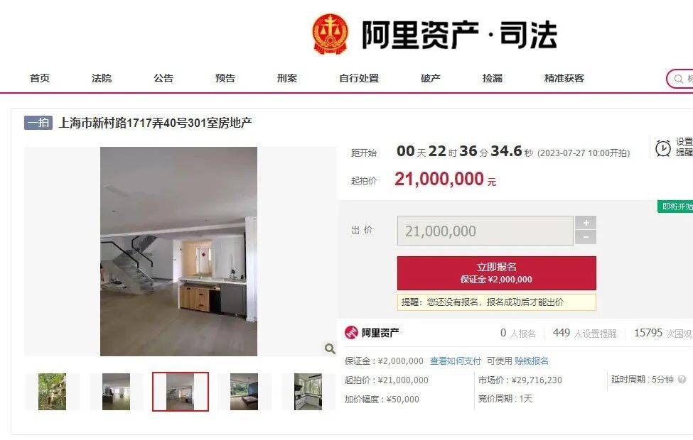 這兩套房子,其中一套位於上海,起拍價2100萬元,另一套則位於北京,起拍價5500餘萬元。