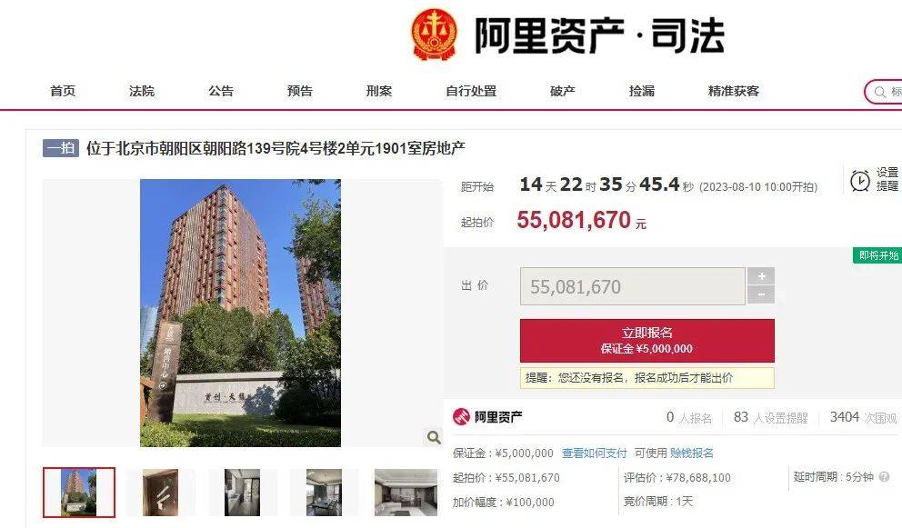 根據競買公告,這套房的評估價為78688100元,起拍價為55081670元,保證金為500萬元,增價幅度為10萬元,將於8月10日開拍。