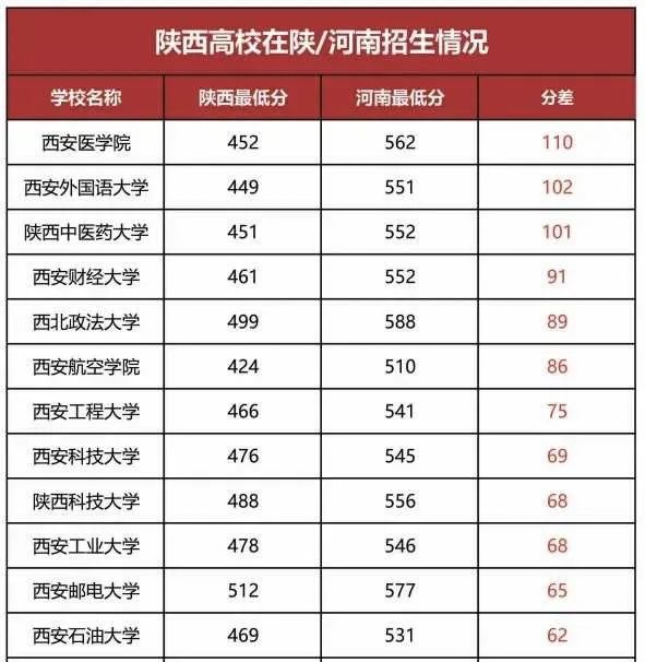 有人統計了一下陝西部分高校在河南錄取分數線與在陝西錄取分數線的分差,普遍高個六七十分,多的能高出上百分。