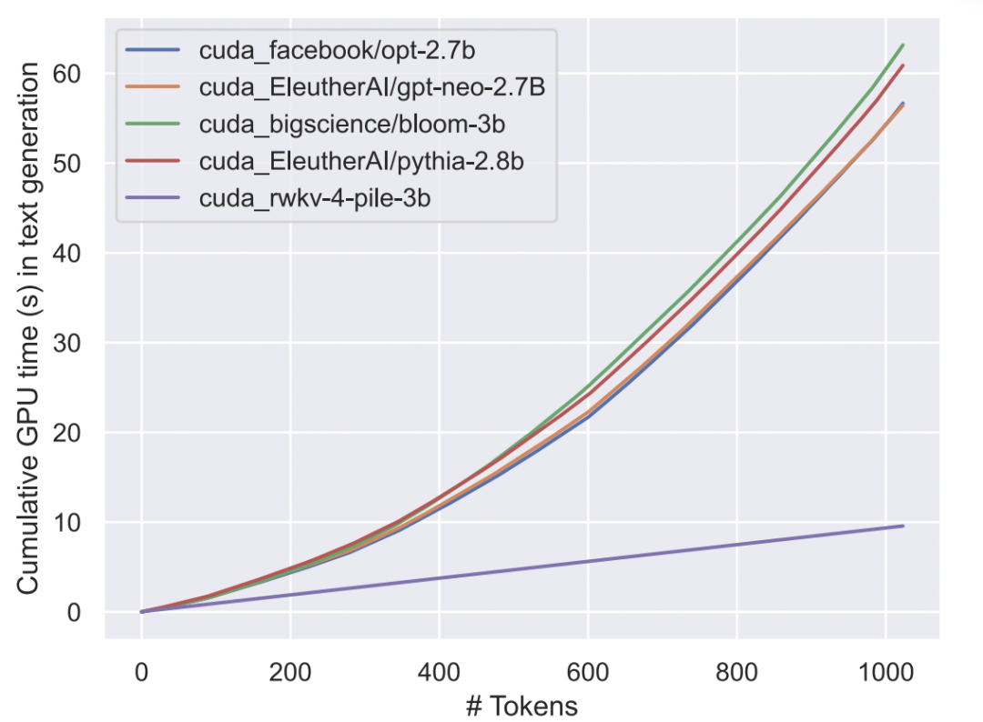 隨Token增加,不同 LLMs 在文本生成上的時間|來源:RWKV 論文