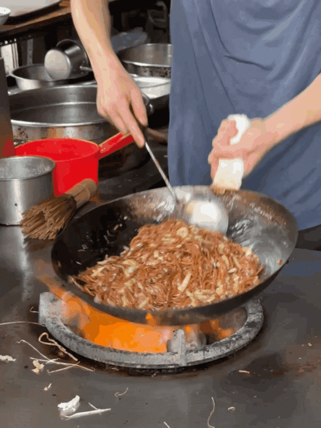 老闆風風火火地甩動鐵鍋,轉眼間幾盤牛肉麪/粉絲就出鍋了。