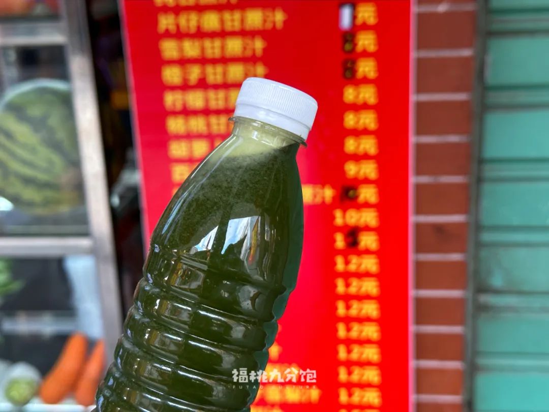 老闆娘抓了幾把片仔癀草,榨出綠色的汁水,再榨了些甘蔗汁,混合成一瓶墨綠色的液體。