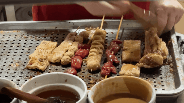 炸串推薦雞翅、藕片、裏脊等,炸完後分別刷上芝麻醬、花生醬、沙茶醬(甜口黨狂喜),怎一個好吃了得。