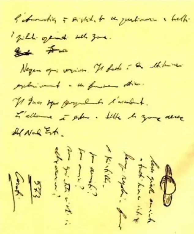 David Grusch稱1933年時曾有一艘外星飛船在意大利北部墜毀,後被墨索里尼秘密帶走。圖中手寫備忘錄據稱記錄了這起事件。