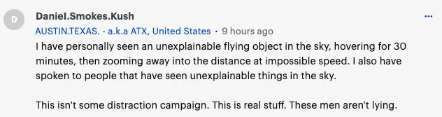 我曾在天上看到過一個不明飛行物,它在空中盤旋30分鐘,然後以不可思議的速度迅速飛走了,我還和其他那些也在天上見過不明物體的人討論過。這不是什麼轉移注意力的事情,這是真實存在的東西,這些人也沒有撒謊。