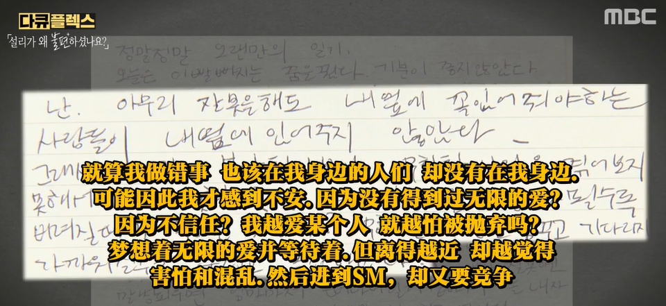 雪莉曾經在綜藝裏,哭着感謝少女時代成員對剛進入公司的自己的照顧,後來看她的紀錄片大家才知道,因為過早地與母親分開,她在很小的年紀完全不懂怎麼照顧自己,頭髮都吹不幹,也洗不乾淨,總是一股餿味,公司的員工會抱着她説“啊雪莉真乖啊”,再嫌惡地別過頭去。
