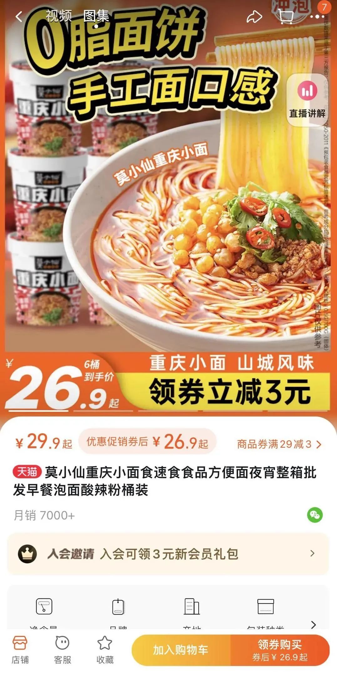 在莫小仙天貓旗艦店,6桶重慶小面券後售價26.9元,淨含量108g單桶價格為4.48元。
