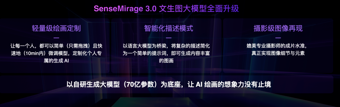 商湯秒畫SenseMirage 3.0是商湯的自研生成式大模型,參數從今年4月首次發佈以來的10億大幅提升至70億量級,能夠實現專業攝影級的圖片細節刻畫,有進階需求的創作者,還可通過簡單拖拽的方式快速完成模型微調,打造個人專屬的生成式AI模型。