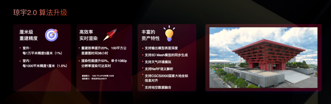 商湯瓊宇SenseSpace 2.0的空間重建效率提升20%,渲染性能提升50%,每100平方公里場景的建圖時間僅需38小時即可完成(1200 TFLOPS/秒算力支持),可更高效地應用於城市級數字孿生場景。