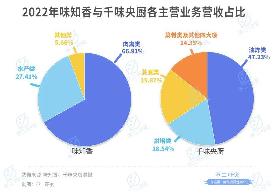 「不二研究」發現,從業績看,味知香、千味央廚的淨利增速均在2022年放緩,且營收增速出現分化;從佈局看,味知香以C端為主、B端為輔,而千味央廚專注B端;從產品看,味知香主攻肉禽水產,千味央廚則專攻速凍米麪製品。
