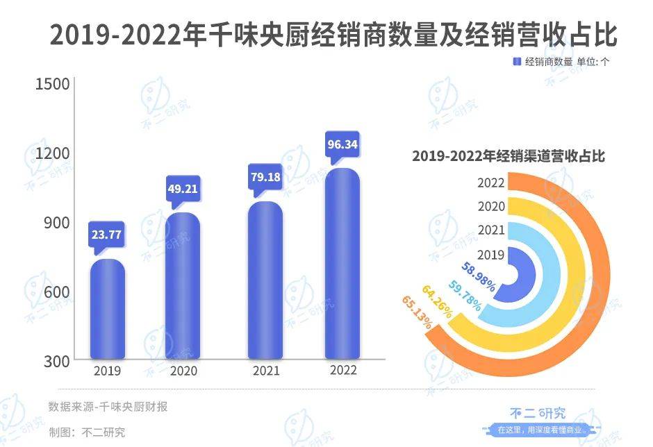 「不二研究」發現,2022年,千味央廚經銷渠道佔比大幅上升。2019-2022年,千味央廚經銷渠道營收佔比分別為58.98%、64.26%、59.78%、65.13%。2022年經銷渠道佔營收比較2021年上升5.35%。