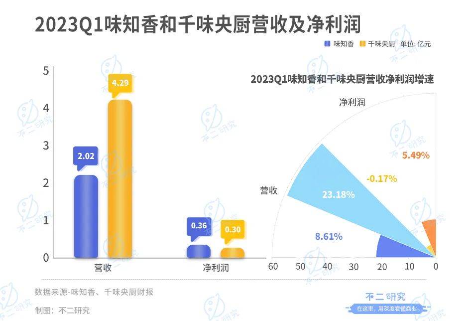 「不二研究」據兩者的一季報發現:今年一季度,味知香、千味央廚的營收分別為2.02億元和4.29億元;營收增速分別為8.61%、23.18%。