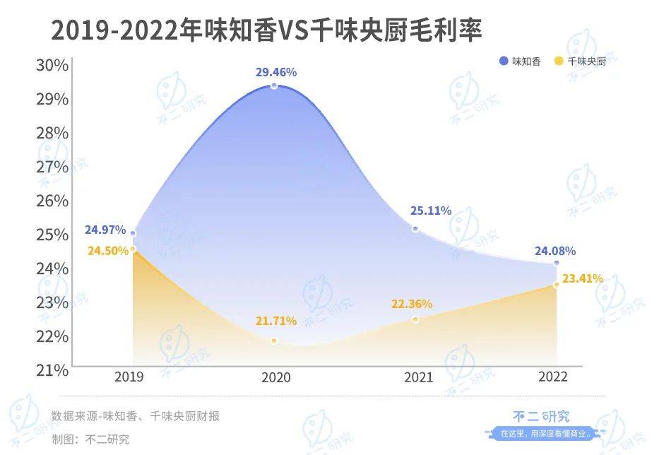 淨利潤分化與味知香、千味央廚的毛利率變化密不可分。據財報顯示,2019-2022年,味知香的毛利率分別為24.97%、29.46%、25.11%、24.08%;同期,千味央廚的毛利率為24.50%、21.71%、22.36%、23.41%。