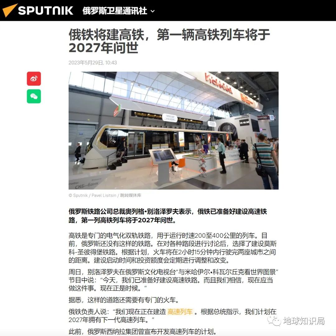 今年5月30日,俄羅斯衞星通訊社在中國各大社交媒體上發佈了一篇題為《俄鐵將建高鐵,第一輛高鐵列車將於2027年問世》的文章。該文直面慘淡的現實,指出俄羅斯還沒有“運行時速200至400公里的列車”。