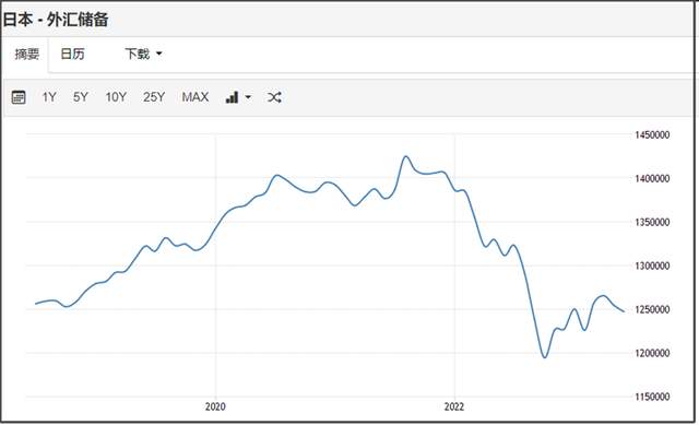 日本外匯儲備去年有過一波大幅下降,現在維持在1.25萬億美元的水平。
