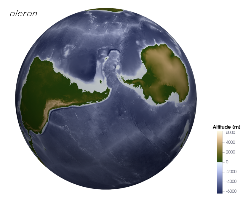 oleron 配色下的地球形貌圖。藍色部分代表海洋地形,綠褐色部分代表陸地地形,白色作為過渡代表海平面。| 來源:參考資料4