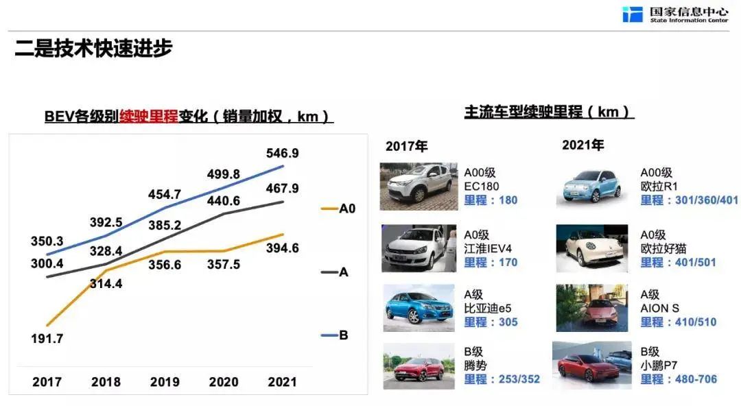與之對應的是每100公里電耗的快速下降,2016年A級純電動汽車銷量加權平均百公里電耗17.8度,2021年同級別車型百公里電耗下降到了12.5度。