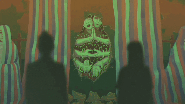 緊接着,小發透過他的視角,看到了一朵綻放的巨大蓮花,在暗紅色的背景中徐徐擴大。頗具佛性的花朵伸展出了一根根手臂,彷彿是埋在淤泥裏的根莖。