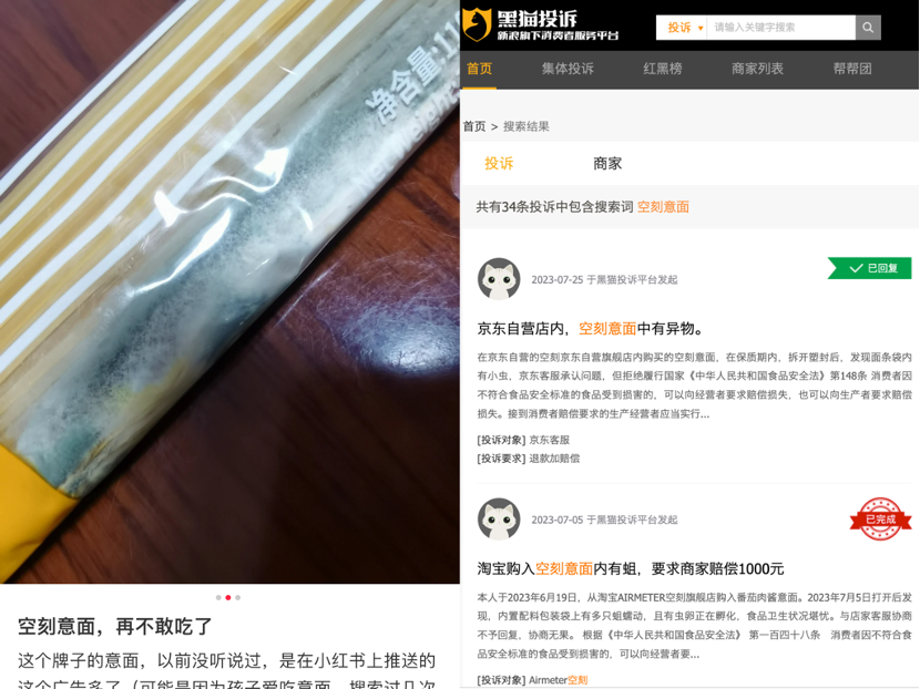 但在眾多社交平台上,不乏有空刻意麪產品存在異物的投訴。