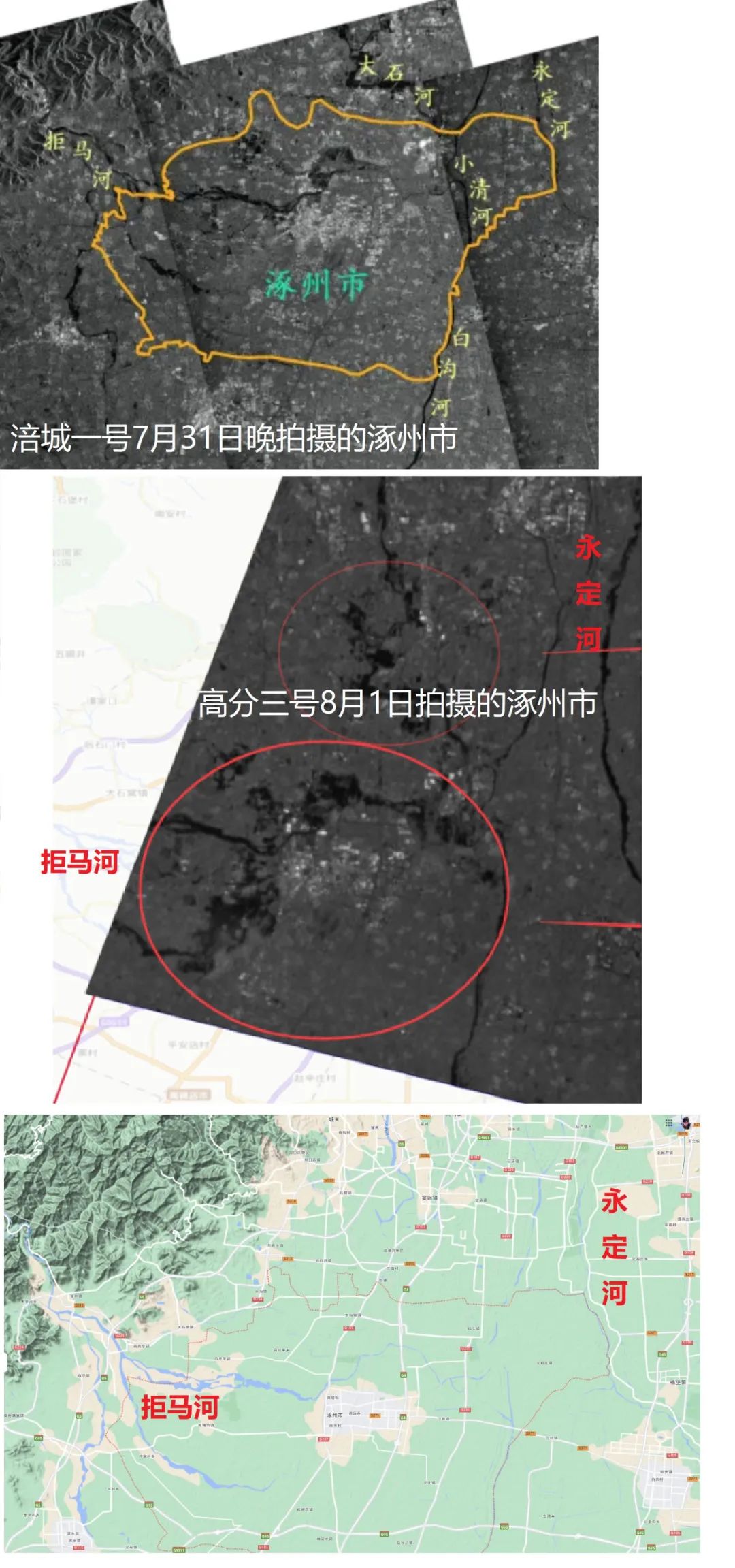 當然,咱們的軍民融合力量最直接的體現,還是航天科技五院研發的高分系列光學衞星。8月1日,高分三號衞星對涿州地區的洪水水情進行了拍攝,光學成像數據直接下傳到地面救災指揮部。同一時段,還有由綿陽衞星產業園“衞星工廠”研製的合成孔徑雷達成像衞星“涪城一號”民用星也對涿州地區的洪峯進行了拍攝。相比光學成像衞星,合成孔徑雷達(SAR)衞星可以在夜間對涿州市區進行雷達成像,成功判明瞭涿州市區的洪澇災害受災面積等信息,為救災提供依據。