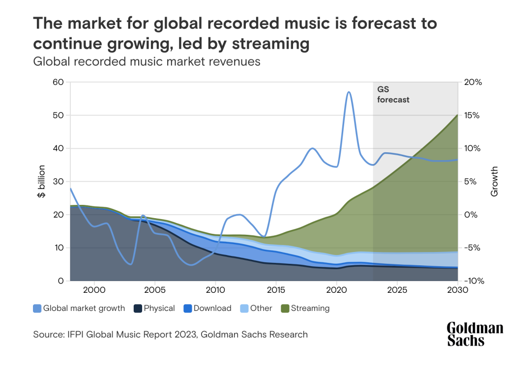 高盛在最新的《Muisc in the Air》報告提到,預計 2023 年全球錄製音樂收入將增長 7.5%(之前預測為 7.3%),2023年至2030年的年增長率為 8.6%(與之前基本持平)。高盛預計,流媒體增長將保持健康,複合年均增長率為 11%(不變)。