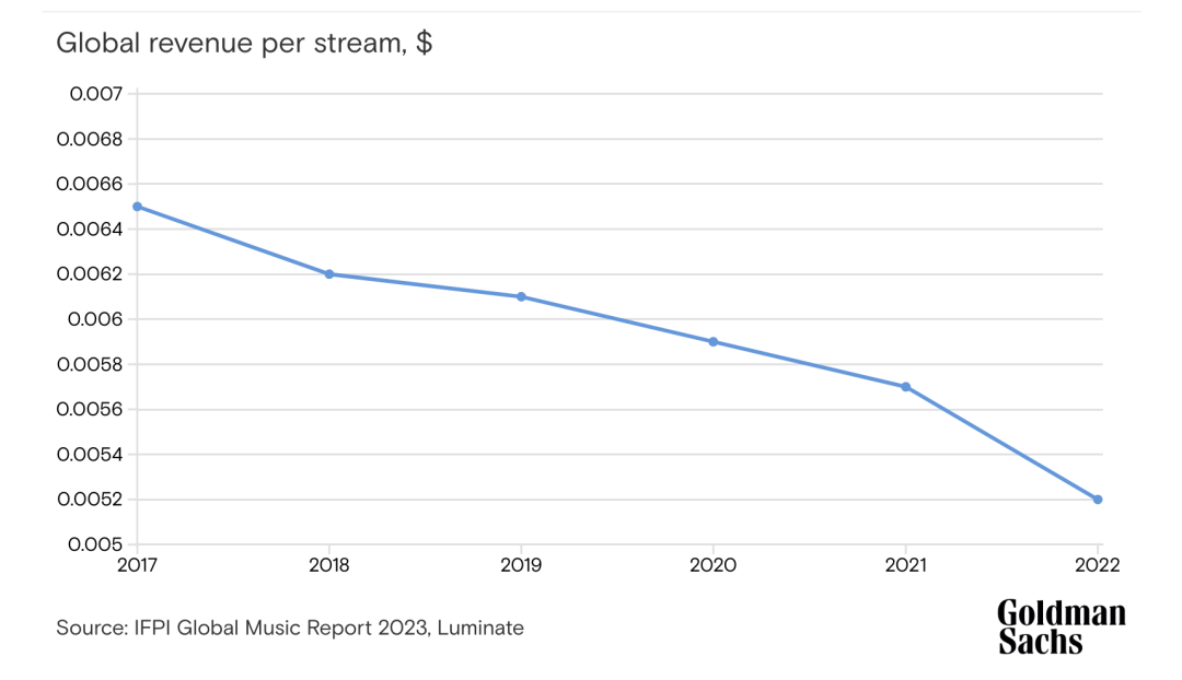 在通貨膨脹、定價策略等多重因素影響下,儘管自2017年以來,音樂流媒體的消費量增加了2.5倍,但同期單次流媒體播放的收益卻下降了20%。