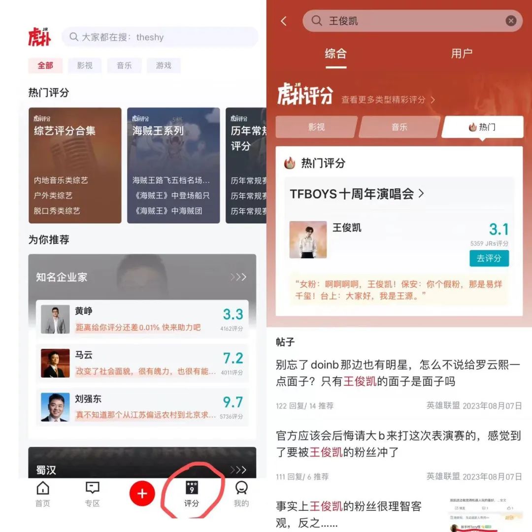 要觀察線上社區希望加碼的內容形態,最簡單的方式就是看其主界面UI設計的變化。在虎撲的主界面中,“評分”已經在底部和“首頁”“專區”升級到同等地位。在虎撲搜索一個人名,最先映入眼簾的不是相關的帖子,而是這個人在各種維度上的“虎撲評分”。可見官方對這一功能的重視程度。