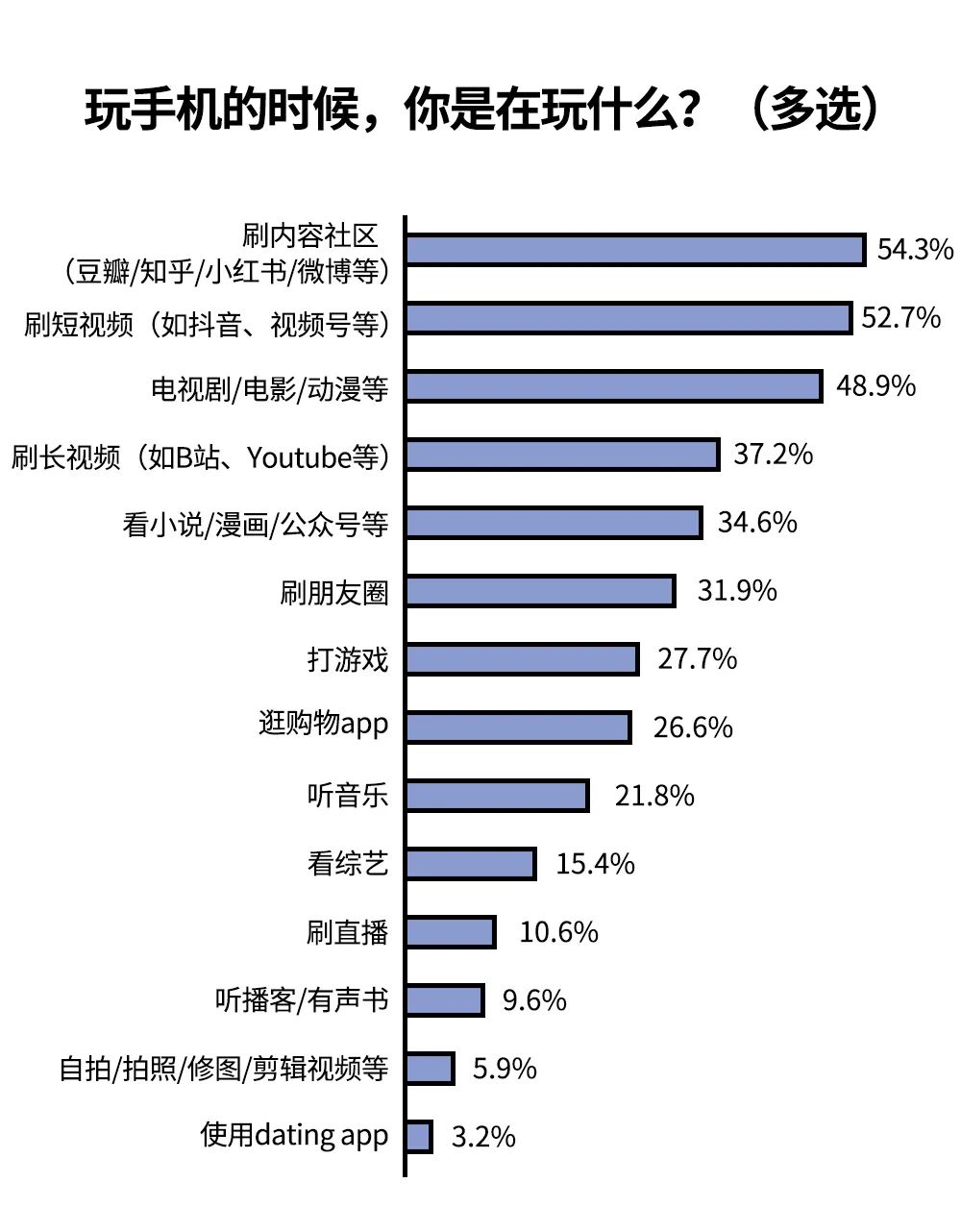 整體上約有一半人玩手機時在刷豆瓣知乎小紅書微博等內容社區(54.3%),刷短視頻(52.7%)和追劇看電影(48.9%)。