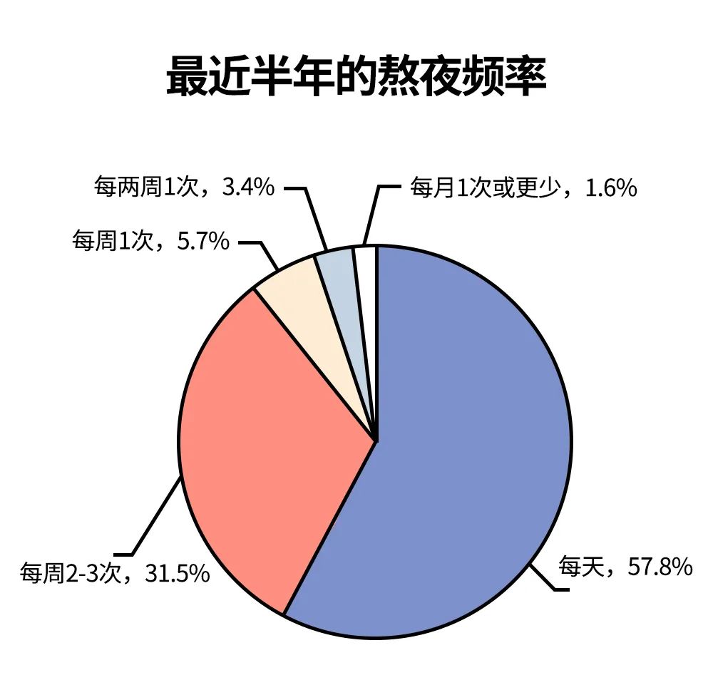 **其中,近 6 成(57.8%)人不分工作日或節假日,每天都在熬夜;**超過 30% 的人每週會熬 2~3 次。有 16.6% 的人會在週五週六或者節假日的前一天放縱自己。