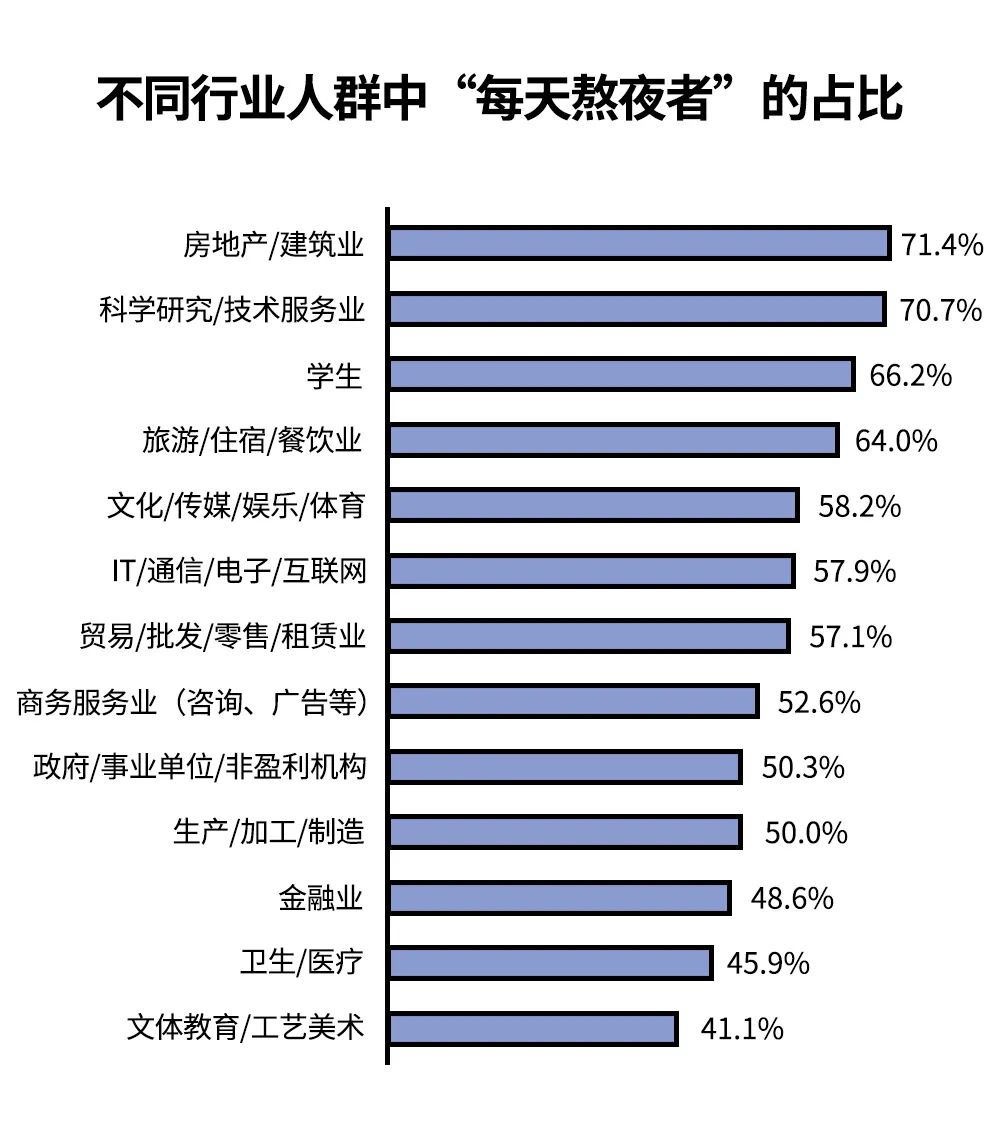 **「每天熬夜」top3 行業分別為:房地產/建築(71.4%)、科學研究/技術服務業(70.7%)、學生(66.2%)。**大家普遍認知中的一些加班「重災區」行業,如:文化/傳媒、互聯網、諮詢、廣告等也名列前十。