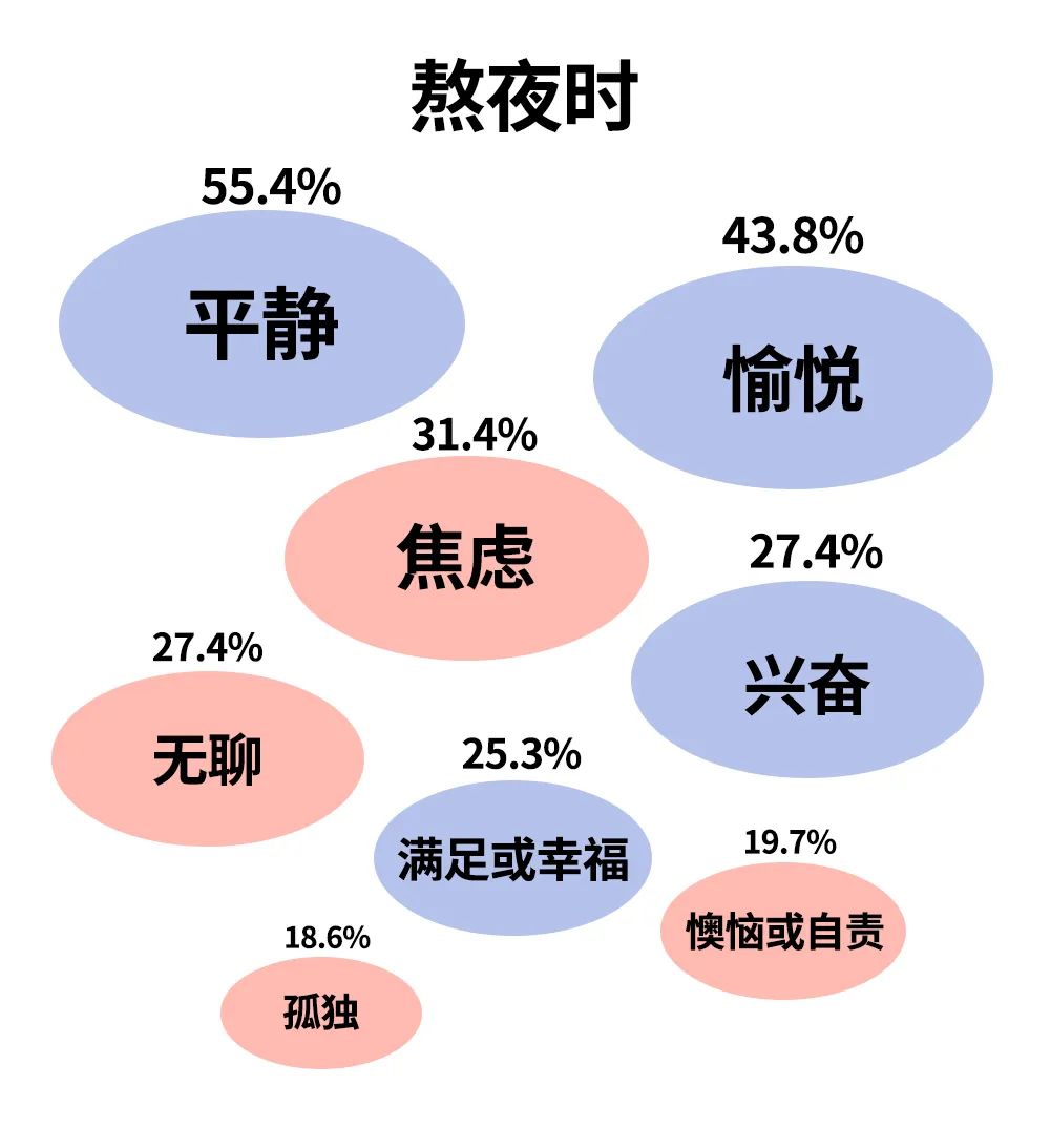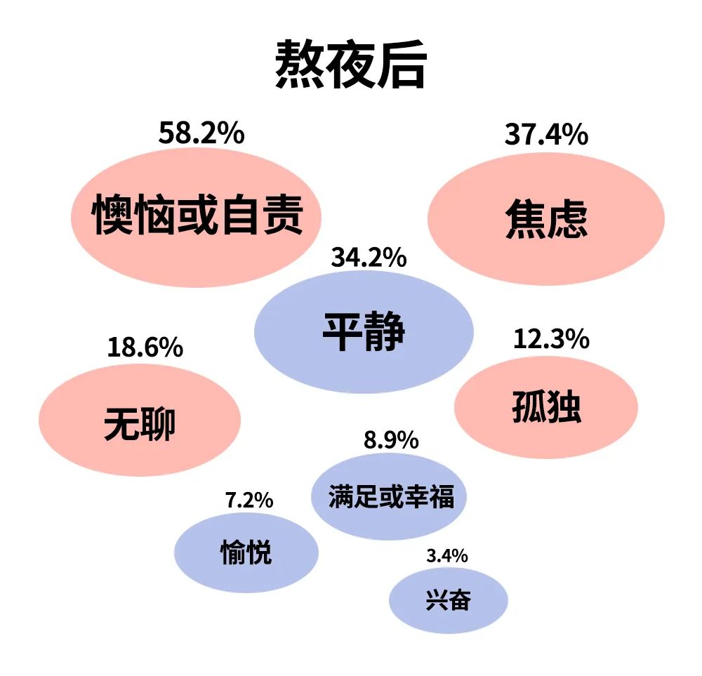 熬夜時,大家體驗到的情緒 top3 是:平靜(55.4%)、愉悦(43.8%)和焦慮(31.4%)。但熬夜後,負面情緒佔據主導,58.2%受訪表示自己會陷入**「懊惱或自責」**。