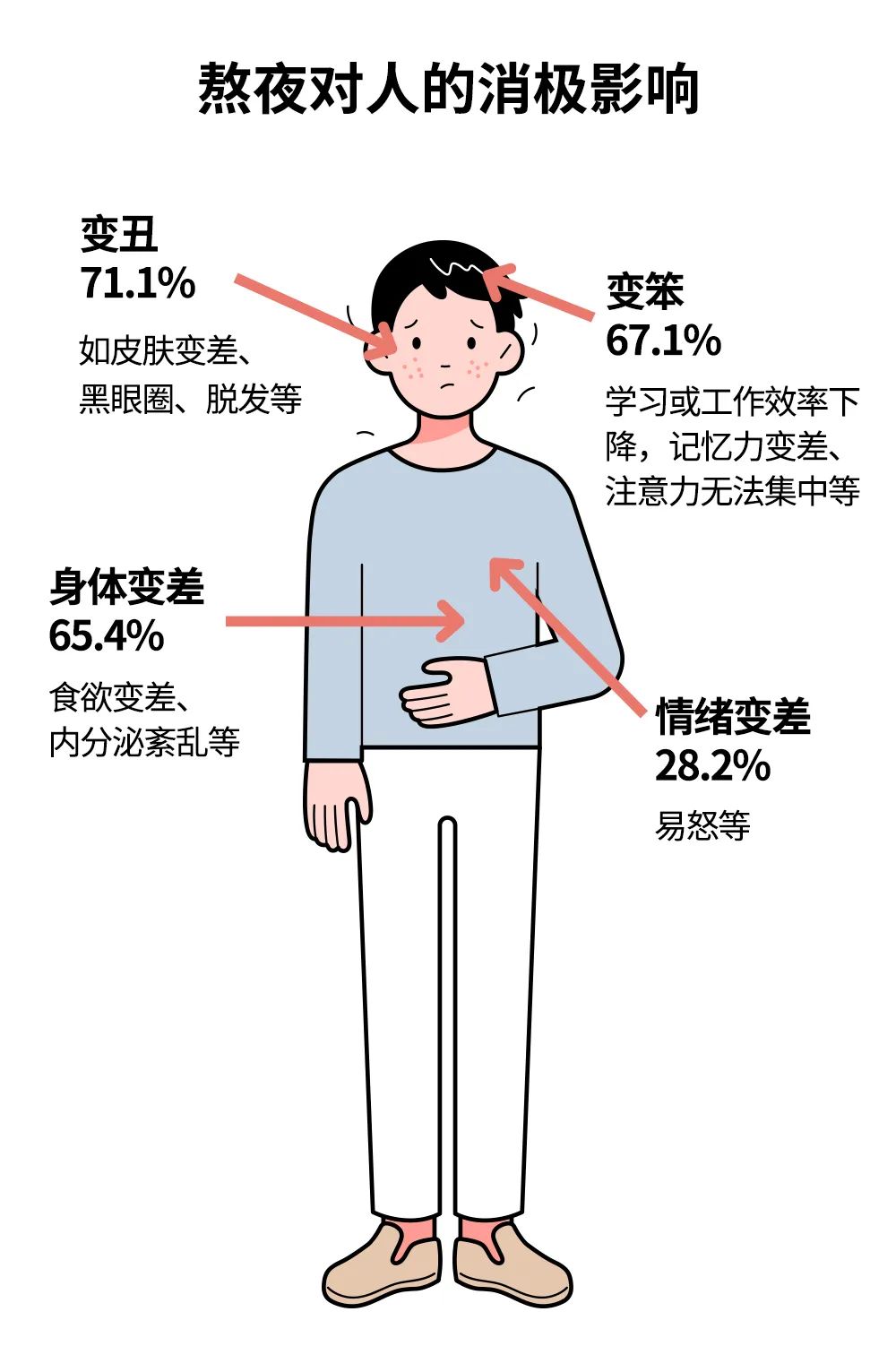 具體來説,有超過 7 成受訪者認為熬夜最主要的消極影響是**「影響外表外貌,如皮膚變差、黑眼圈、脱髮等」**,其次是讓人「變笨」、「身體變差」及「情緒變差」。