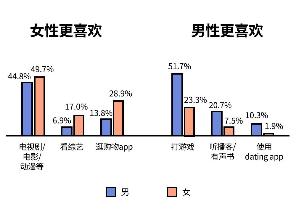 相比女性,男性熬夜時更喜歡打遊戲(51.7%)、聽播客有聲書(20.7%)和使用 dating app(10.3%);女性更多在看劇看電影(49.7%)、逛購物app(28.9%)和看綜藝(17%)。