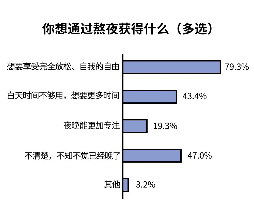 將近八成人因為**「想要享受完全放鬆、自我的自由」**而選擇熬夜。這印證了前文提到的,大家需要通過熬夜獲得對自己生活、時間的掌控感。