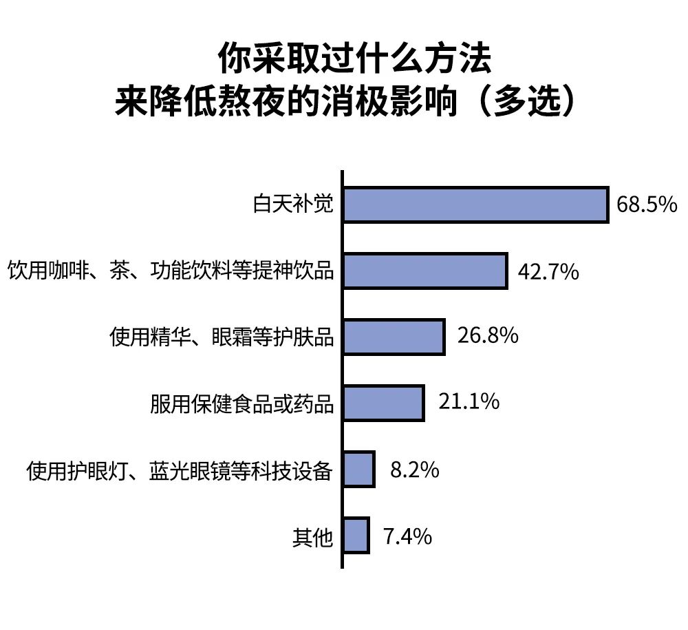 在降低熬夜消極影響的方法中,被選擇最多的是**「白天補覺」(68.5%)**。 第二、第三是飲用咖啡等提神飲品(42.7%)和使用護膚品(26.8%)。