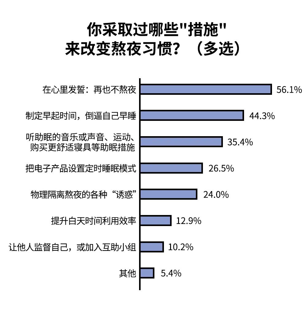 除了**「在心裏發誓」**(56.1%)以外,有 44.3% 的人曾「制定早起時間,倒逼自己早睡」,35.4% 的人則嘗試各種助眠手段,來試圖改變熬夜習慣。