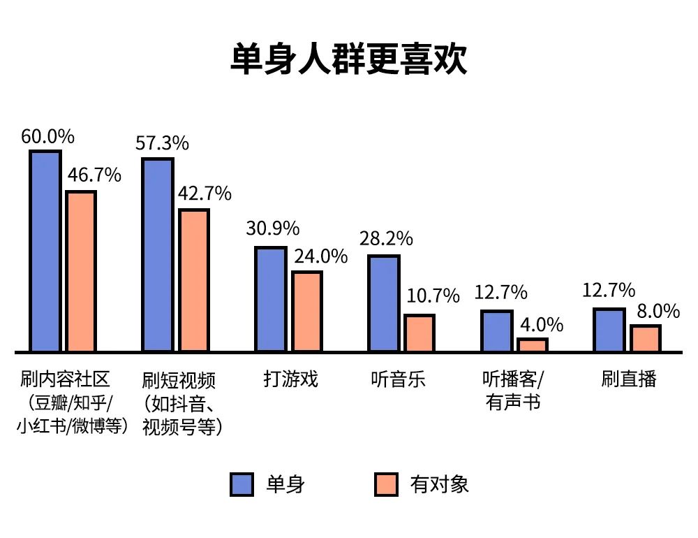 單身人羣更多刷微博小紅書等內容社區(60.0%)、刷短視頻(57.3%)和打遊戲(30.9%)
