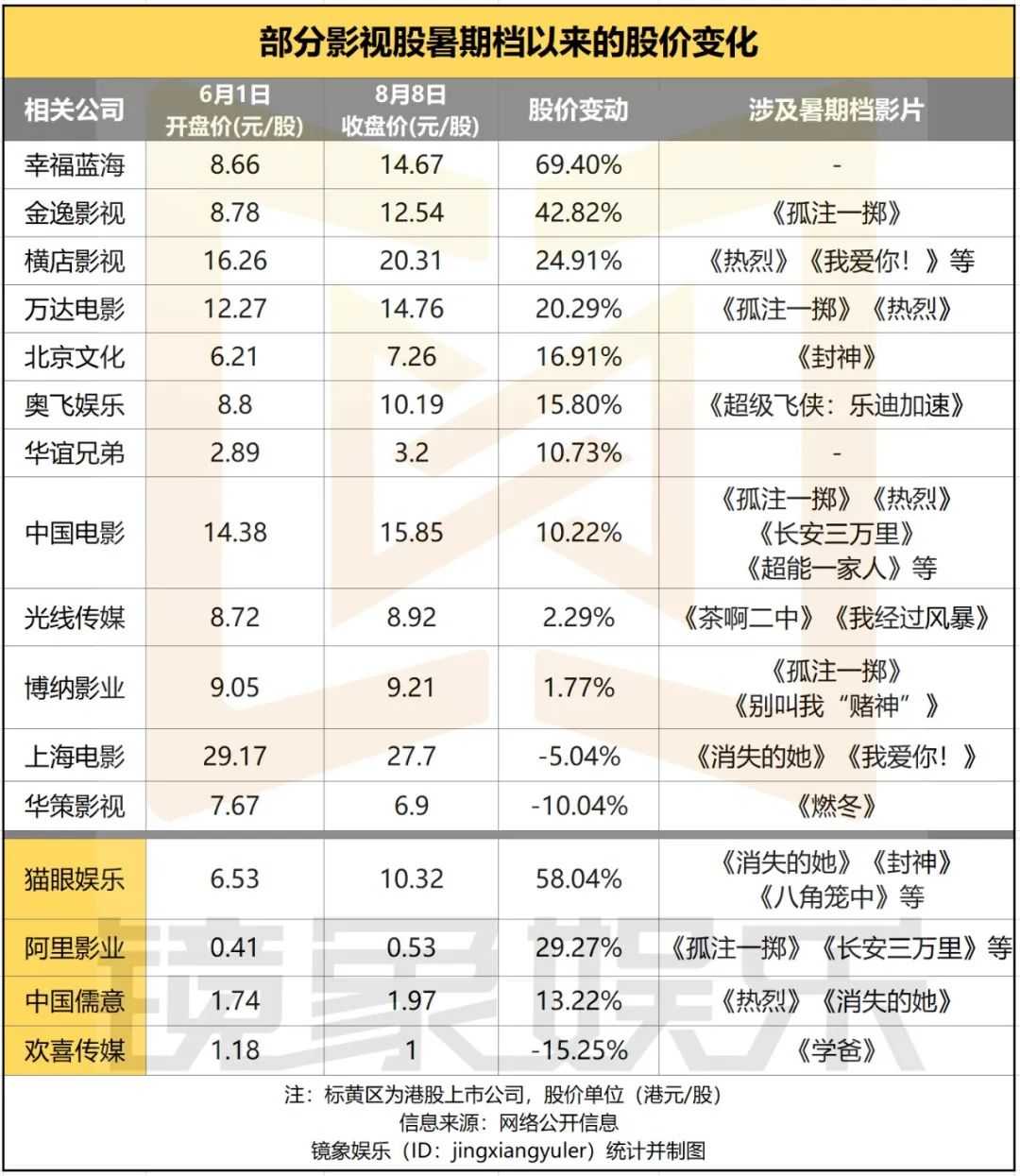 此外,股價變動較大的還有票務及互聯網宣發平台背後的上市企業。截至8月8日,港股上市公司貓眼娛樂股價累計上漲超58%,淘票票背後的阿里影業也出現近30%的漲幅。
