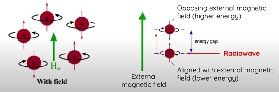 當把原子核置於恆定磁場中後,其內稟自旋受磁場影響會偏向和磁場一致的方向,此時原子核具有最低的磁力勢能。