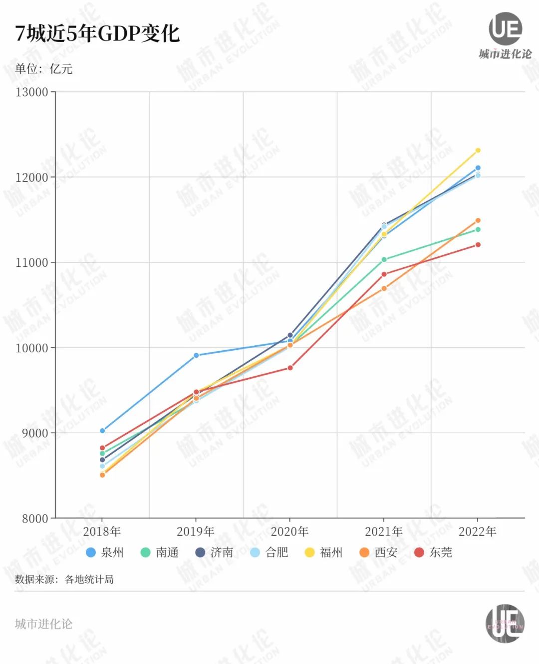 2020年,泉州、南通、福州、西安、合肥、濟南6城先後官宣晉級,集體躋身“萬億俱樂部”。這一年,GDP最高的濟南與最低的合肥差距不過135億元。到2022年,福州與南通之間的差距已超過928億元。