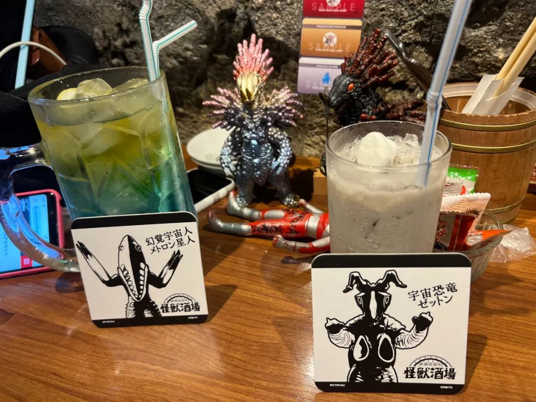 當然,與其説是代表城市夜生活的居酒屋,更像是為粉絲準備的奧特曼主題animate cafe,一進門便能看到兩尊迎賓的門神:哥莫拉和傑頓。