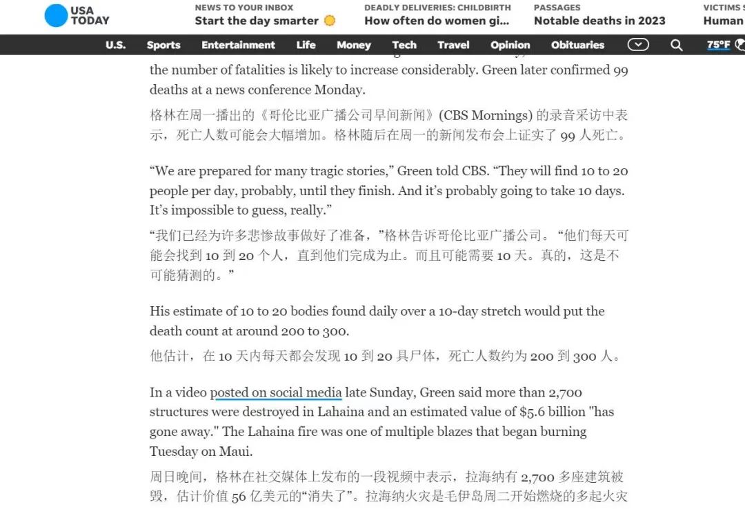 不過,就算這個“吹哨人”和他/她的爆料都是一些推特上的營銷號編造出來吃美國人血饅頭的,但至少有一點他/她/它沒準還真説對了,那就是此次毛伊島野火所造成的死亡人數,或許真的不只是區區90來人而已。據今日美國新聞網報道,夏威夷州長喬什·格林已於日前明確表示,拉海納火災所造成的實際死亡人數,可能還得在目前公佈出來的99這個數字的基礎上翻上一倍,甚至是三倍。