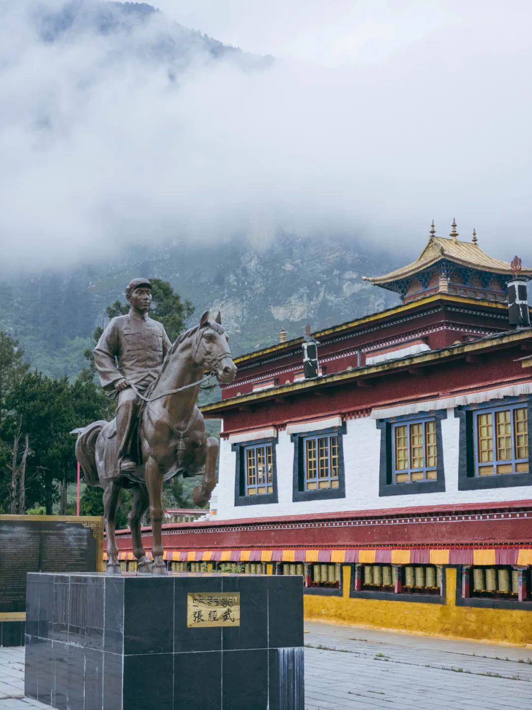 沿着古時的商路,從日喀則到亞東除了途徑康馬縣有些小溝壑之外,基本都是坦途。進入亞東溝之後海拔陡然下降,氣候也隨之發生遽變。快到亞東縣城之前會經過東嘎寺,東嘎寺是我見過的最魔幻的寺廟之一,我怎麼都沒想到這個地方現在居然會變成一個愛國主義教育基地,寺廟大殿外面立着一尊中共將領、中央人民政府駐西藏代表張經武的塑像,嚇得我目瞪口呆。