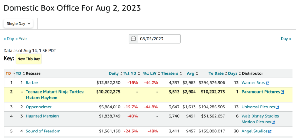 據The-Numbers統計,《忍者神龜》鋪開至北美3513家影院,在首日拿到1020萬美元,不及《芭比》排在榜單次席;隨後《忍者神龜》在週末斬獲2801萬美元,單館收益為7973美元。若計入兩個工作日的進項,則《忍者神龜》前五天共累計至4308萬美元。