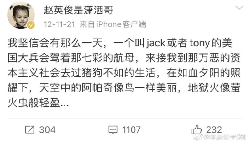 “一個叫做Jack或者Tony的大兵,駕着七彩的航母來接你,接你去自由世界過人上人的生活,在如血夕陽的照耀下,阿帕奇像鳥一樣輕盈,子彈像螢火蟲一樣美麗……”。