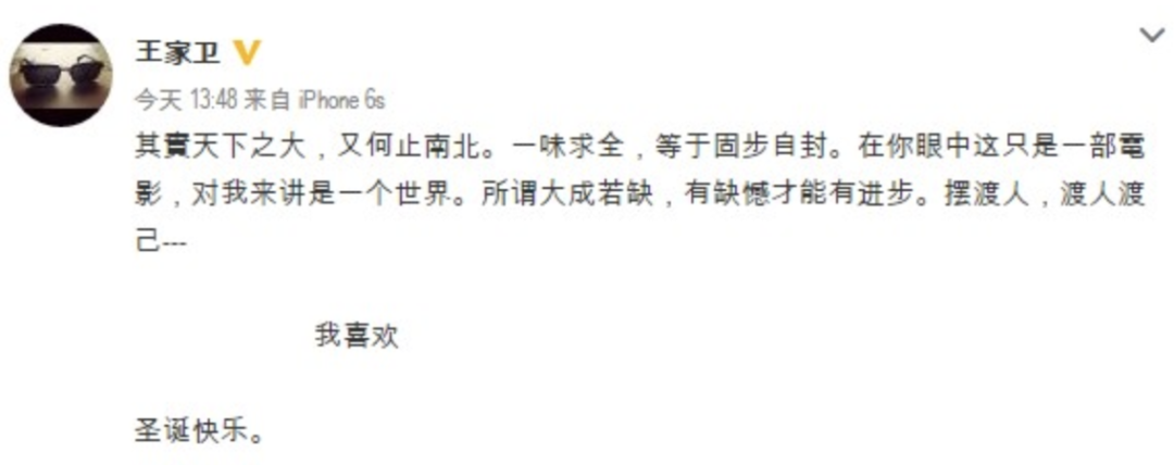 半年後,王家衞監製、編劇的《擺渡人》口碑撲街,他在微博強行挽尊,説“擺渡人渡人渡己,我喜歡”。