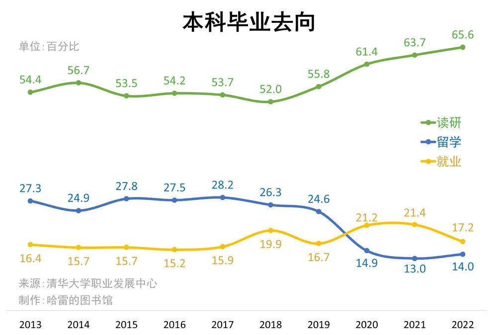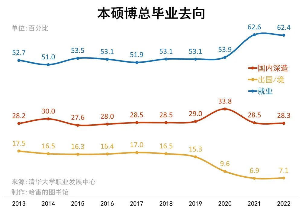 2013~2019年的7年裏,畢業生出國比例都穩定在16%左右,近3年的突發性降低有更多的臨時因素,並不意味着留學和出國這一選擇失去了價值,2023屆以後很大概率會回升到正常水平。