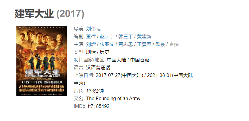 這是建國大業三部曲最後一部,從出品方就知道,中影和八一製片廠都是主要出品方,從題材也知道,這才是真正重大革命歷史題材,無論從那方面來看,《建軍大業》都比《戰狼2》更加根正苗紅,更加主旋律。