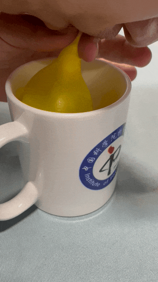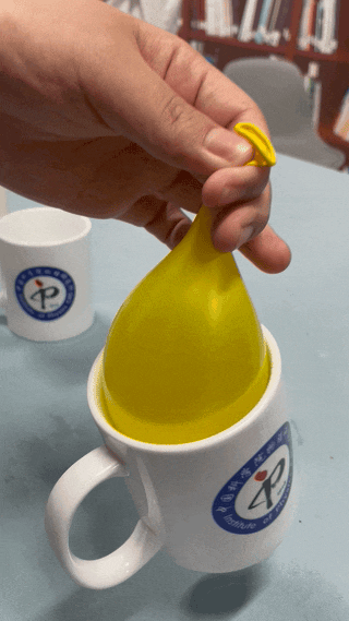 捏緊氣球,可以發現通過提拉氣球的底部可以將所標杯提起。